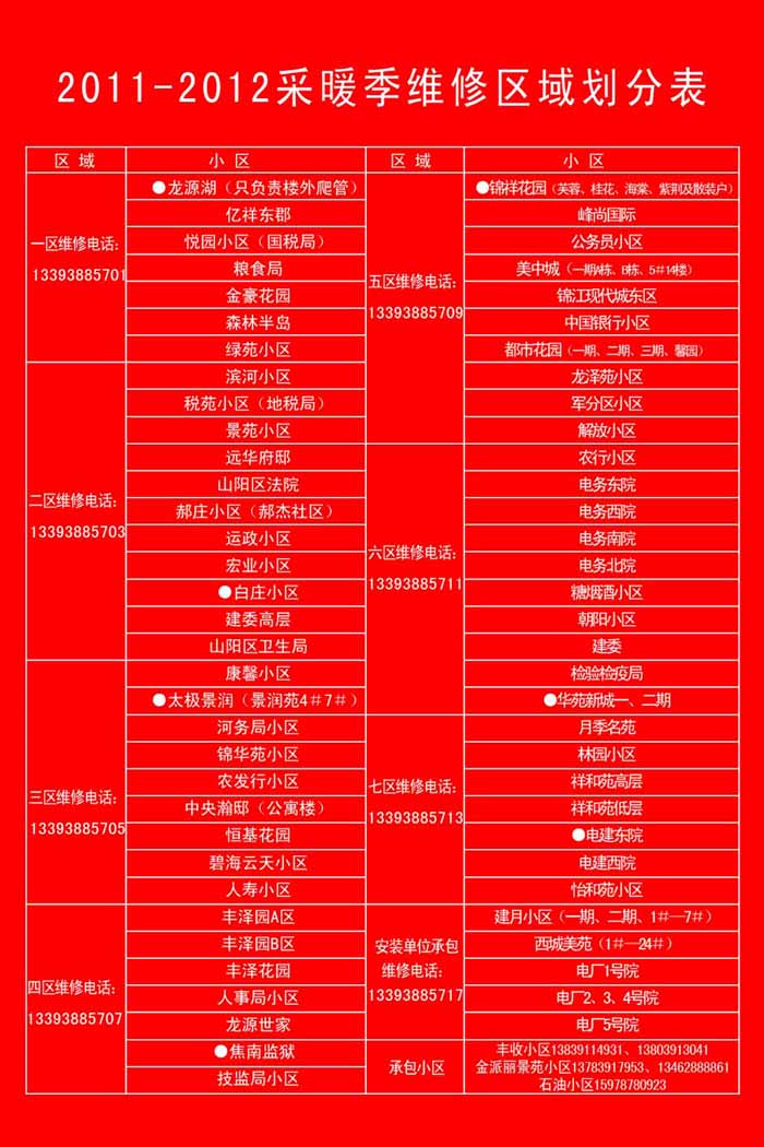綠源公司今年在正常開通3681088報修電話的基礎(chǔ)上,采取報修電話服務下小區(qū)方式,將用戶服務范圍分為八個片區(qū),在每個片區(qū)另外設(shè)立一個報修移動電話,方便居民及時報修,具體劃分請見下表: